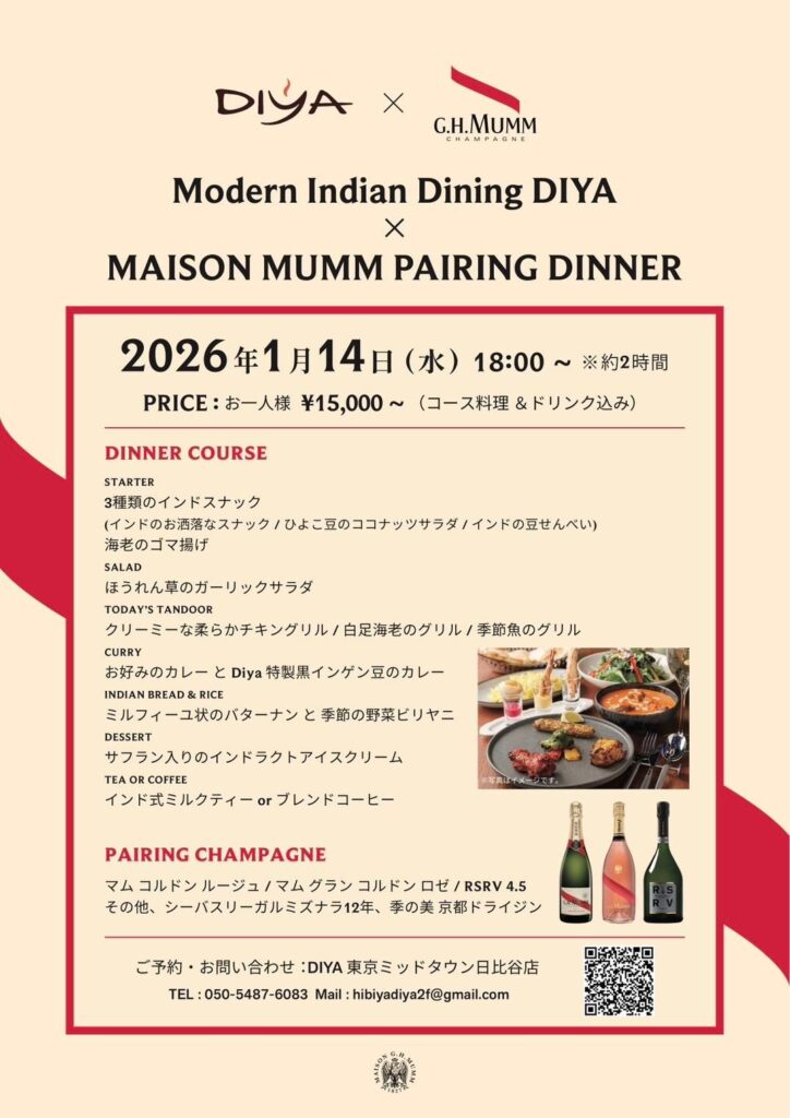 モダンインディアン「DIYA」と、名門シャンパーニュ《MAISON MUMM》が織りなす、一夜限りのガストロノミー・ペアリングディナー を開催いたします。